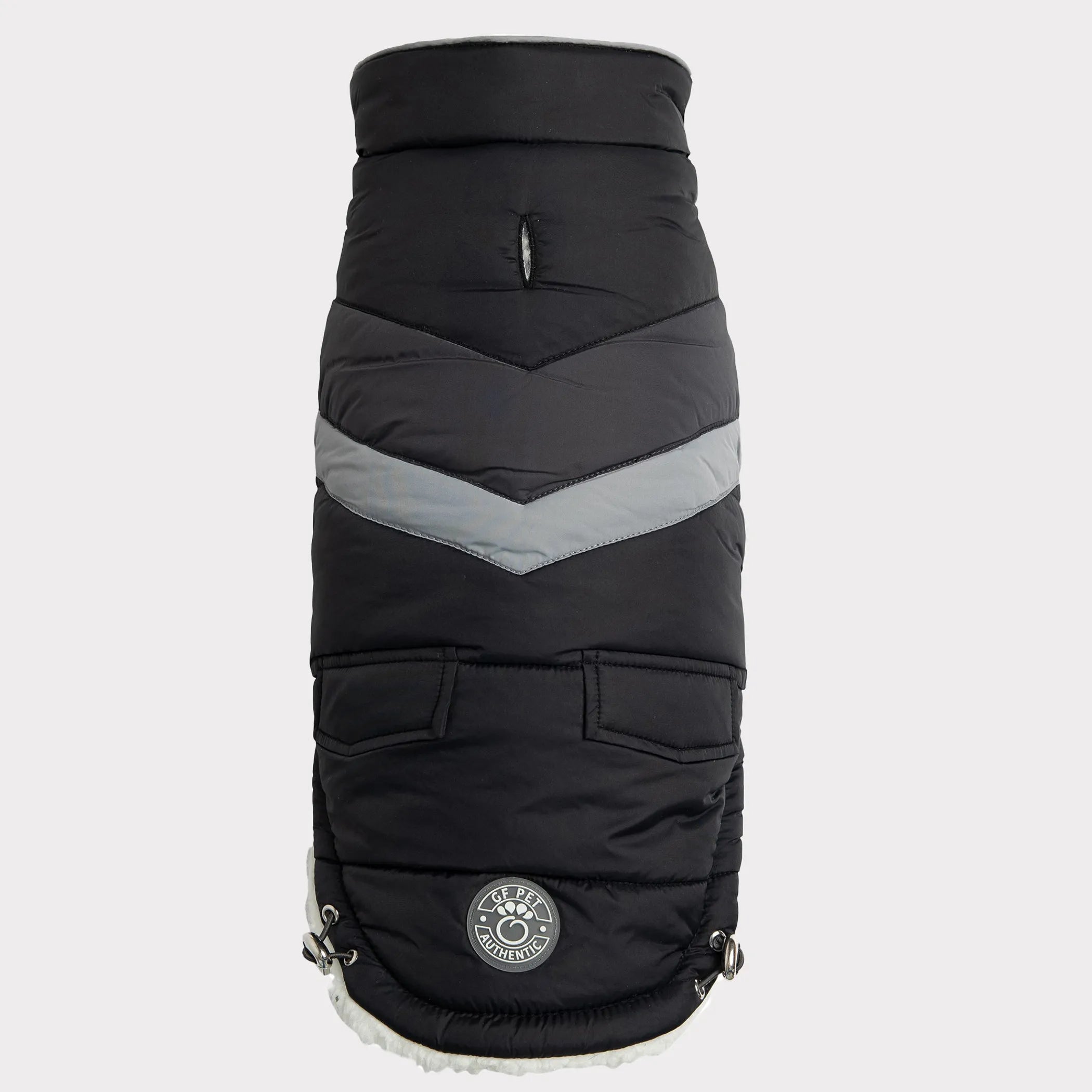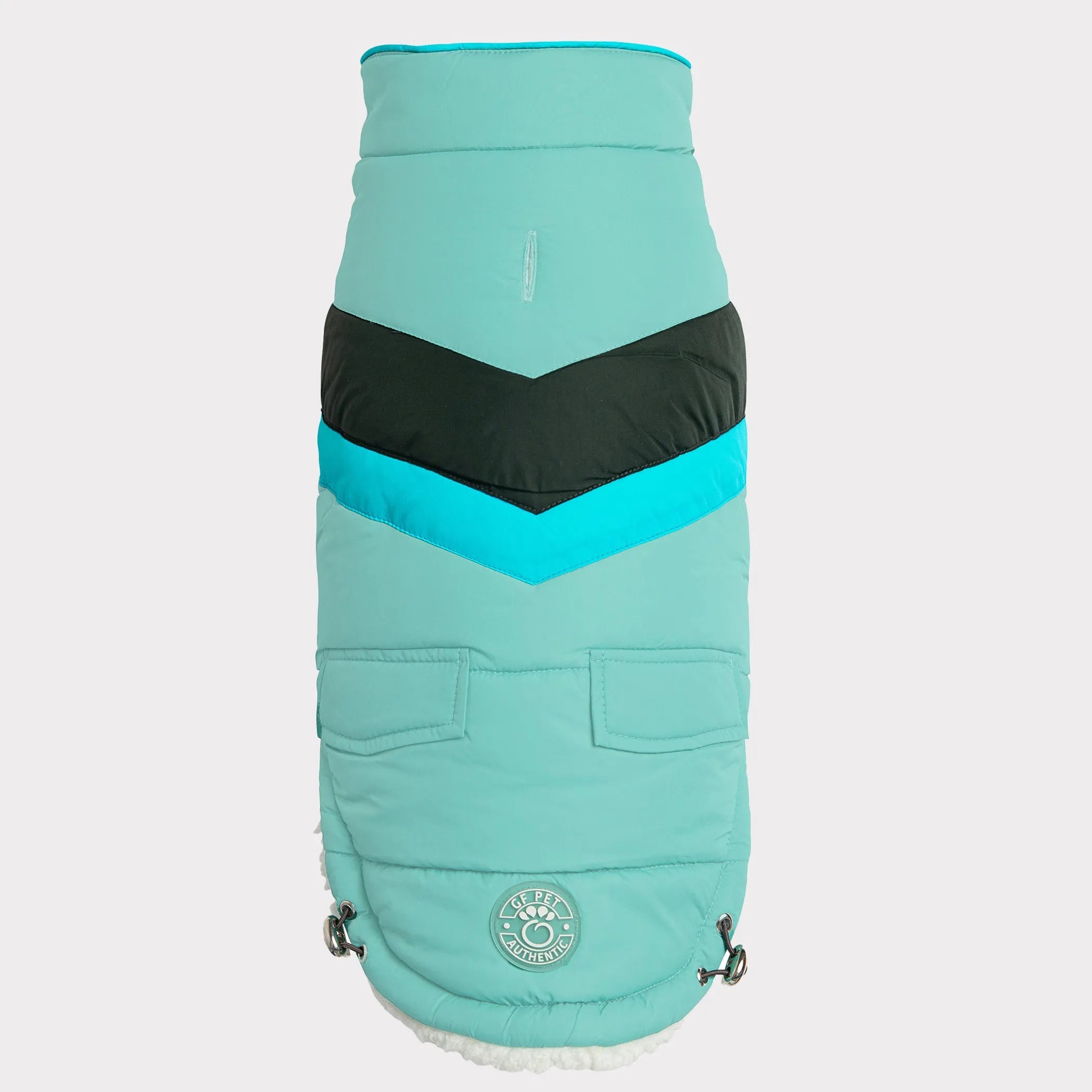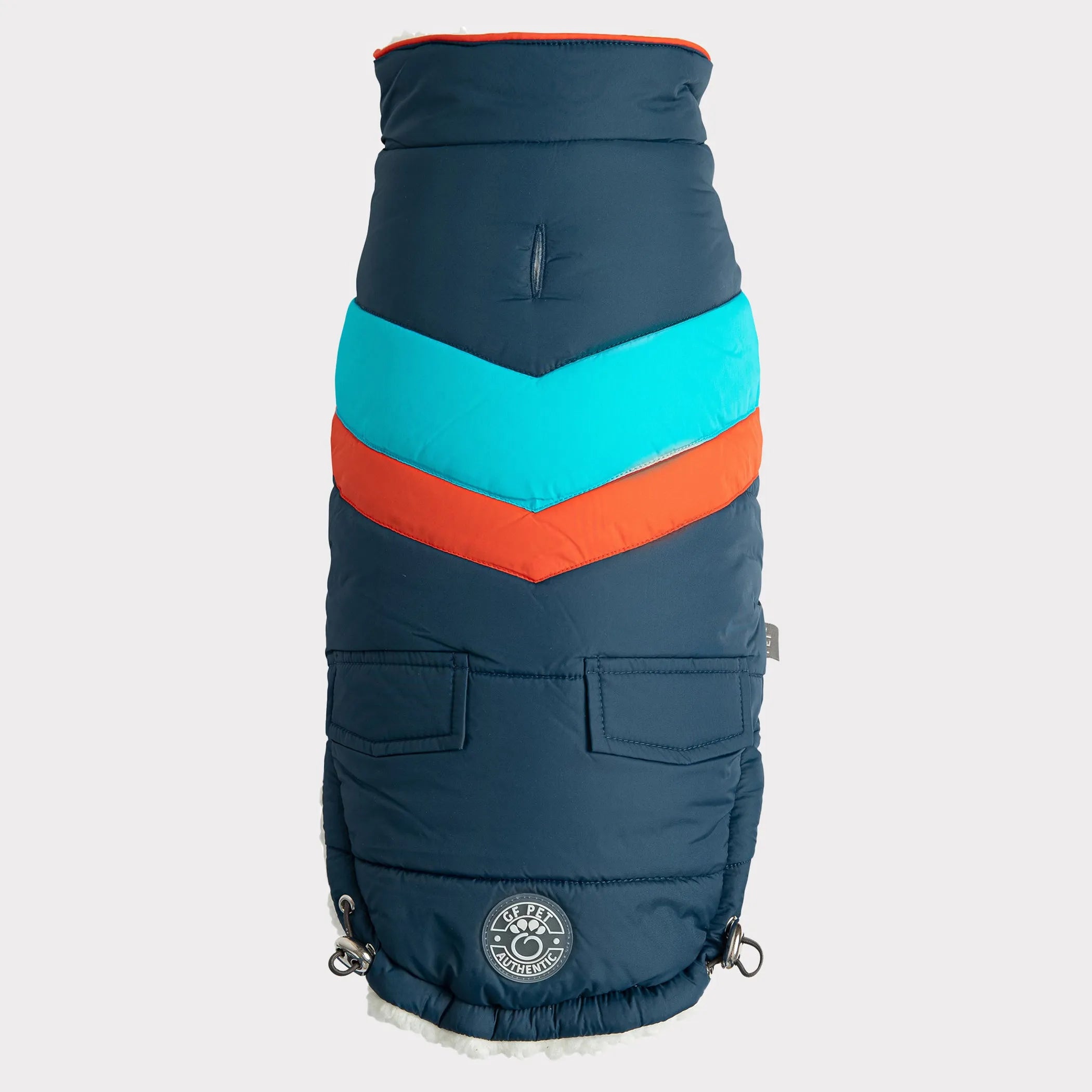 The GF Pet Alpine Puffer is a great choice for active dogs who are looking for carefree fashion and warmth. It's a modern take on a retro chevron design, with faux pockets and next-generation styling. With GF Pet signature contrast piping and snuggly-warm, popcorn Sherpa lining, the Alpine Puffer keeps it real. Water repellent and super-adjustable, with patented Elasto-Fit technology, this coat is designed to keep dogs looking cool while staying warm.