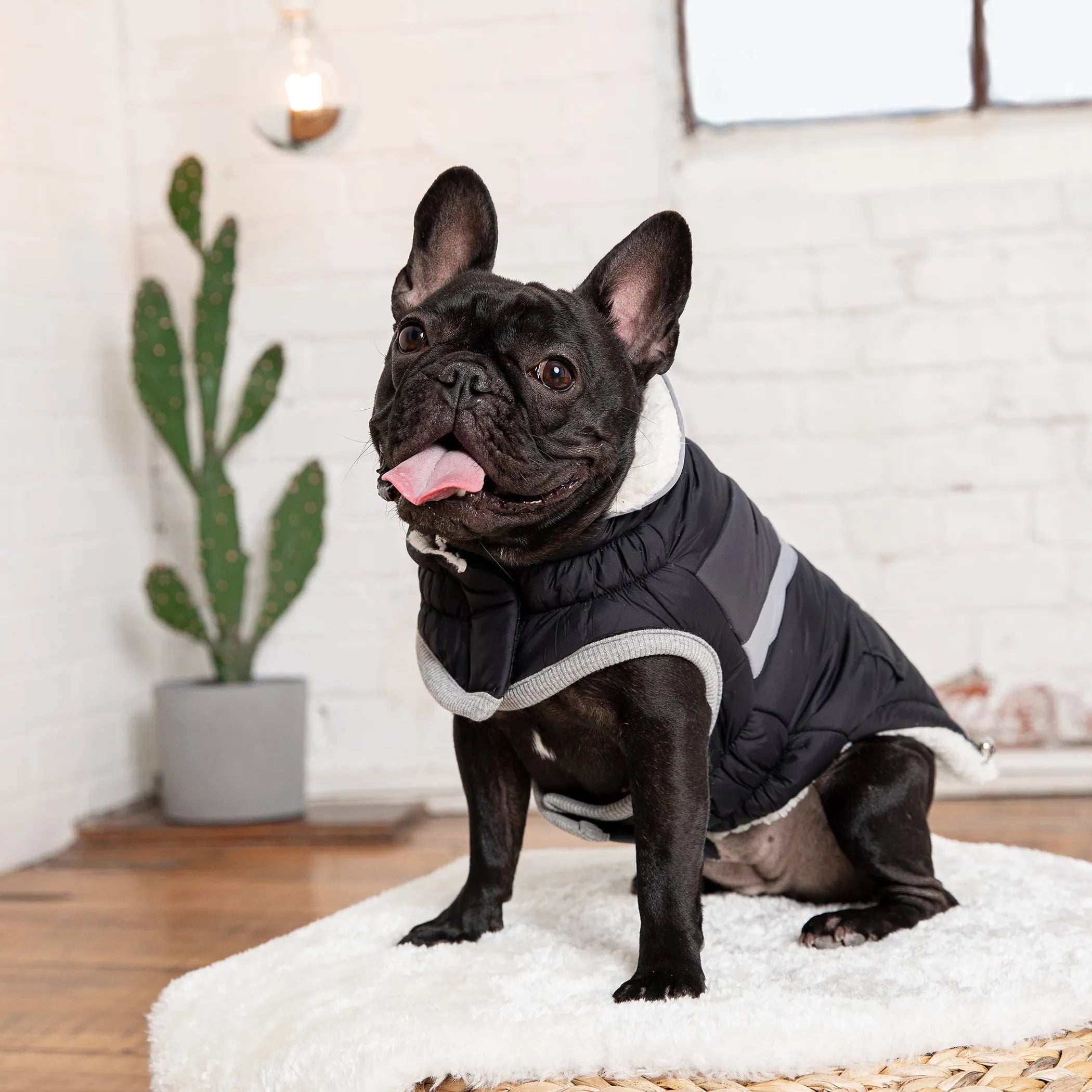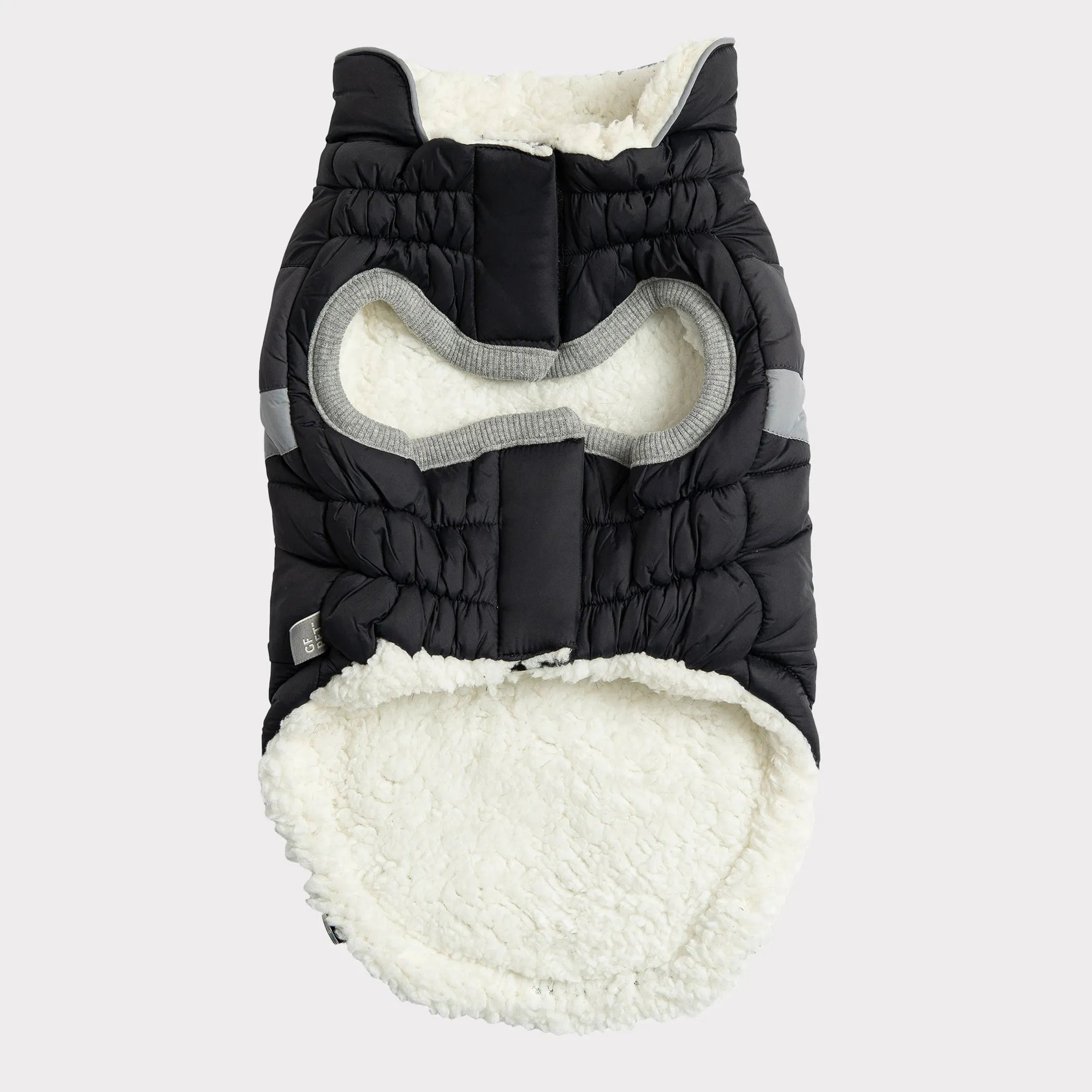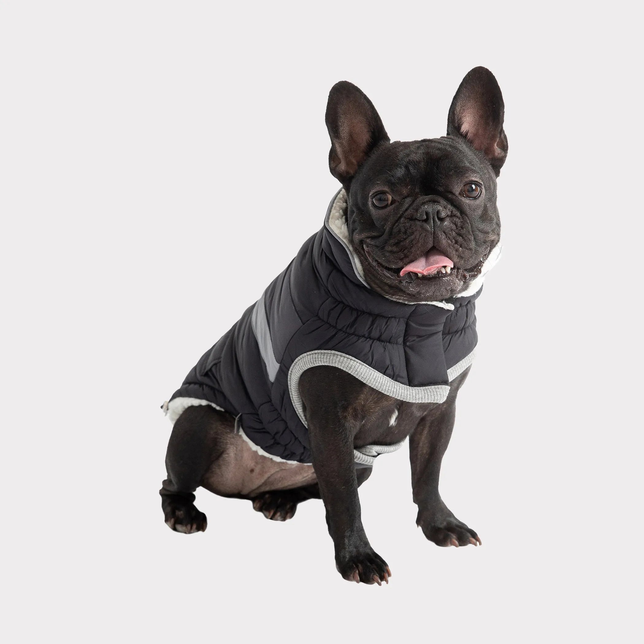 The GF Pet Alpine Puffer is a great choice for active dogs who are looking for carefree fashion and warmth. It's a modern take on a retro chevron design, with faux pockets and next-generation styling. With GF Pet signature contrast piping and snuggly-warm, popcorn Sherpa lining, the Alpine Puffer keeps it real. Water repellent and super-adjustable, with patented Elasto-Fit technology, this coat is designed to keep dogs looking cool while staying warm.