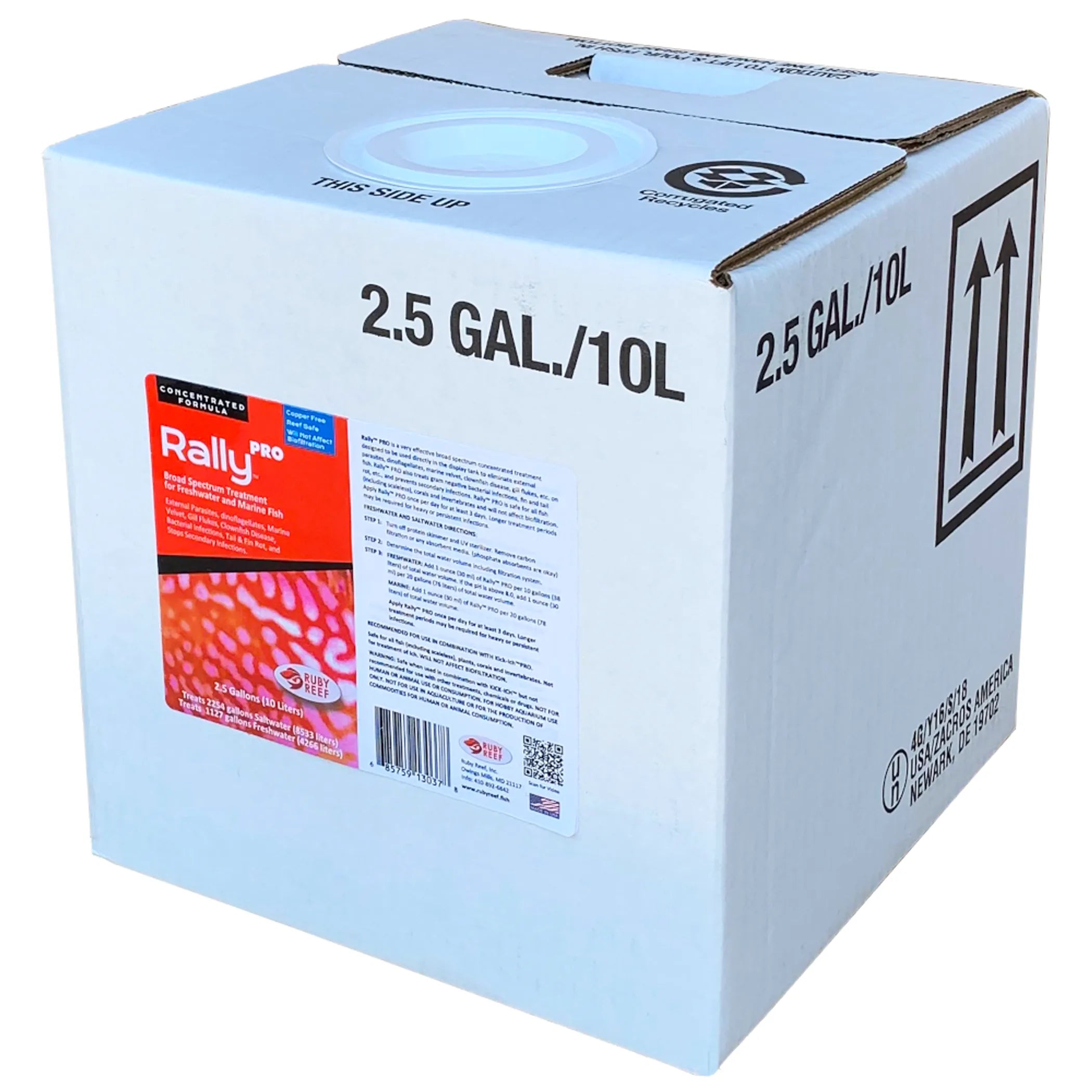 Rally PRO is a very effective broad-spectrum concentrated treatment designed to be used directly in the display tank to eliminate external parasites, dinoflagellates, marine velvet, clownfish disease, gill flukes, etc. on fish. Rally PRO also treats gram negative bacterial infections, fin and tail rot, etc., and prevents secondary infections. Rally PRO is safe for all fish (including scaleless), corals and invertebrates and will not affect biofiltration. Rally PRO will turn the water a yellowish green color. It is temporary, not harmful, will not stain and will fade away as Rally biodegrades out of the tank. Apply Rally PRO once per day for at least 3 days. Longer treatment periods may be required for heavy or persistent infections. Wait 3 to 4 days to allow Rally PRO to complete the treatment before resuming normal operations. Rally PRO is biodegradable and will be completely out of the tank in 3 to 5 days.