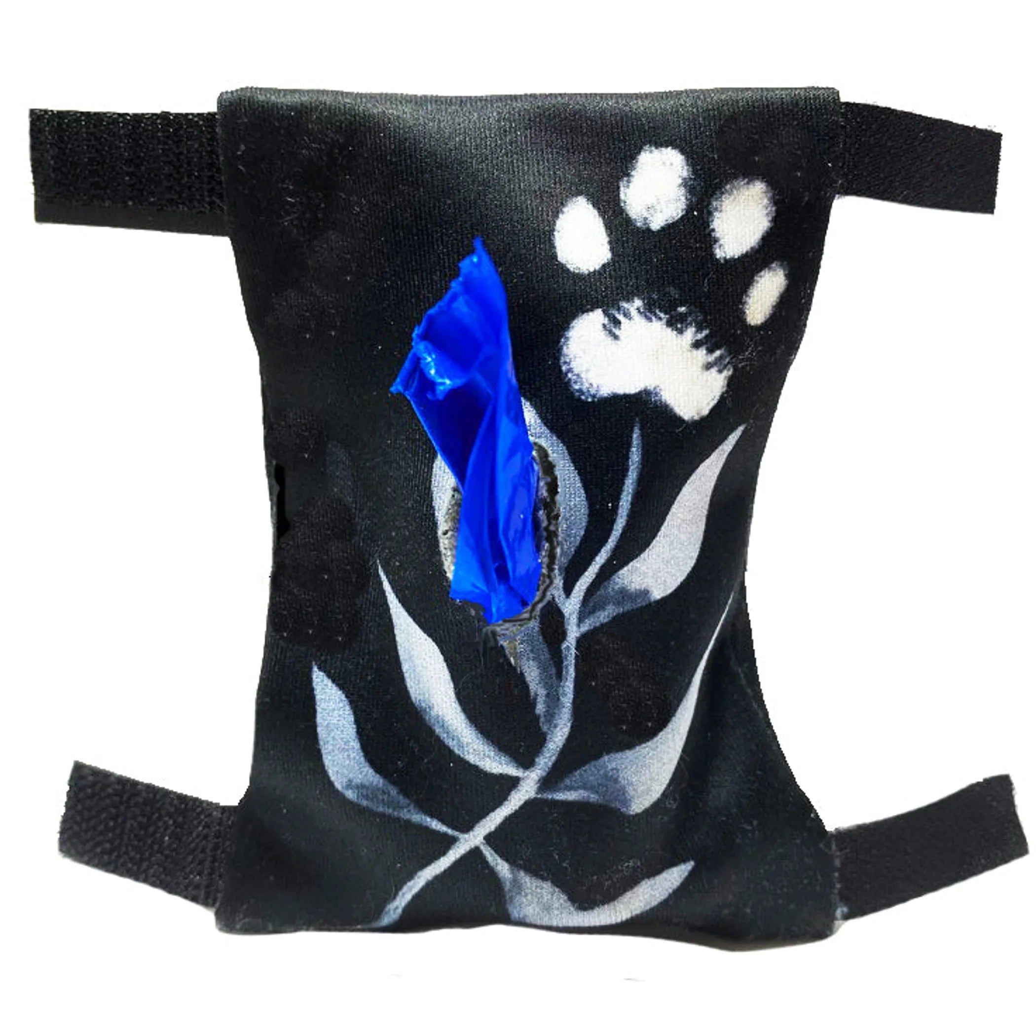 To use: Slip roll of bags inside back flap. Thread first bag thru the front slit. Then, using the two velcro tabs, secure around your leash.